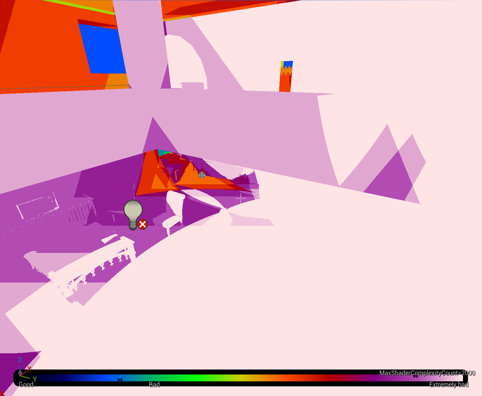 Lighting is one of the things I struggled with the most for this project. I had added lights to my project when I was blocking out the level. However this was done before I learned the best uses for each type of light. Because of this when checked the light complexity of my level I found that most of the house was either white or light purple which is not good. This light complexity showed that the lights were overlapping which caused more complex math to be done and as a result the level was not performance friendly. The picture below shows the light complexity map before I changed the lights.
