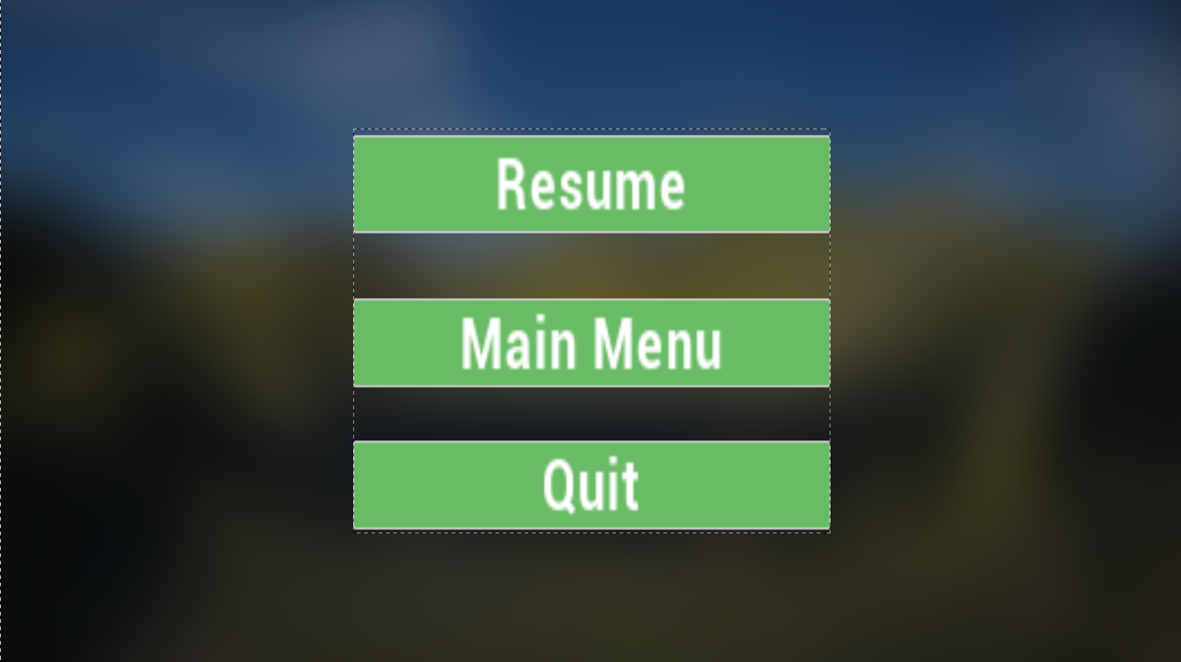 I decided to use the same image from my main menu for the pause menu however I decided to blur the image even more. I also decided to have three buttons stacked vertically in the middle of the screen. The top button is a resume button. This allows the player to return to the game. The middle button was to return to the main menu. The bottom button is a quit button which allows the player to quit the game however it does not save the game before the player quits. I decided to make each button the same shade of green. This is because I wanted to keep the natural feel that came from the blurred background while also making sure the buttons were still visible.