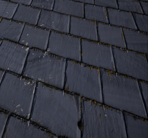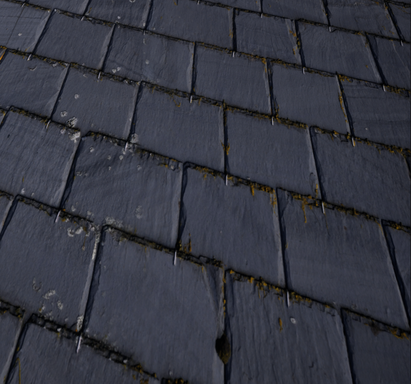 I decided to use this material from Poly Haven for the roof of the house. This is because I felt it looked closed to how shingles look without looking to urban. I wanted the roof to feel like it had dirt and grime on it from surviving the elements at the base of a mountain. I liked how the grimier bits between the tiles looked along with the material I used for the landscape. It helps make the house feel older and more lived in and less newly built.