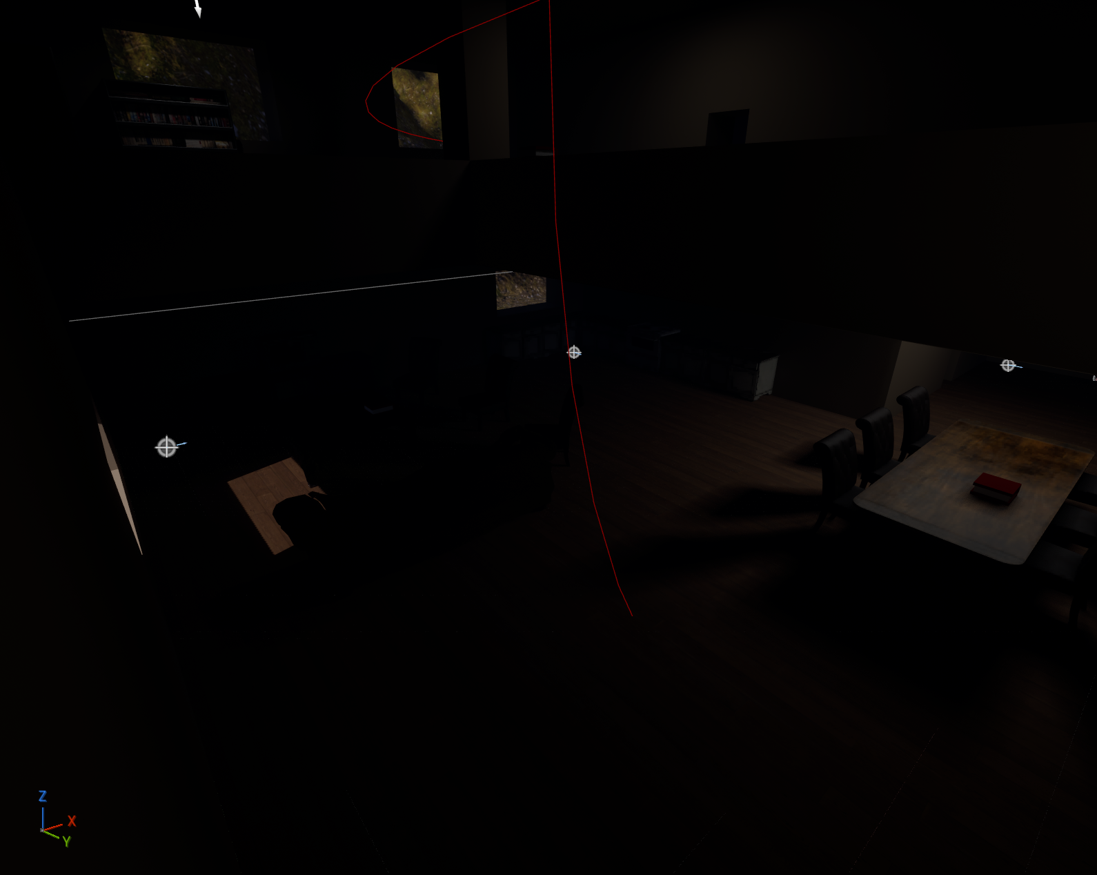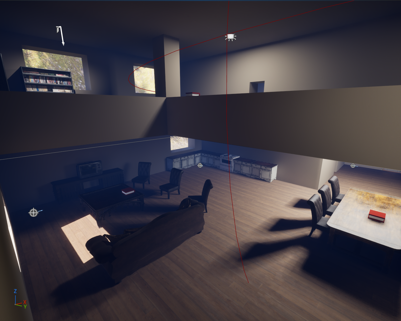 I decided to completely restart with the interior lights. I added lights to my level making sure that the house was lit like it would be in a real house. I wanted the lighting to feel like most if not all of the lights inside the house were left on. I also wanted to be sure that the player could still see the details and important aspects of my level. One of these things is the pile of gold hidden on the second floor. Initially it was tucked in a corner hidden by bookshelves with a point light highlighting the pile. However after changing the lights I felt the gold pile was not noticeable enough. I moved the pile out from behind the bookshelves so that the new lighting would highlight it better and make it less likely to be missed.